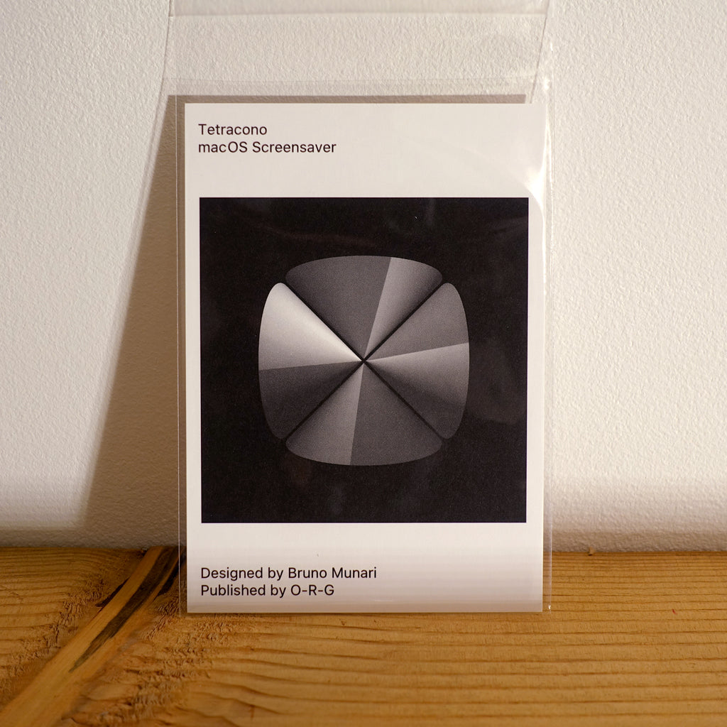 O-R-G, the brilliant software company, creates screensavers among other digital things. They, like Munari are great thinkers and creators. This is their Tetracono screensaver. Our first digital product at KIOSK. For every order you receive a postcard which has a unique download code for the software printed on its "holographic sticker". Software for macOS v10.10+