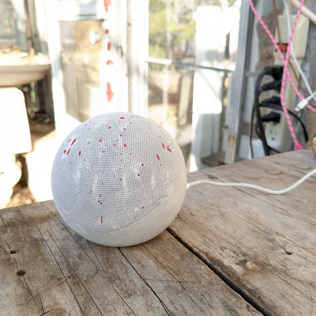It's amazing what these little voice assistants can do. Order home delivery, tell you the mileage of your last car, offer to sell you another voice assistant - among thousands of other useful things. Personally, I use it for the mundane: playing music, setting a cooking timer, and converting between metric and inferior units of measurements. I have asked when next high tide is and Alexa duly replied. I should be able to live without it but I don't want to. Yet, I don't want to host a hunk of colorless molded plastic pretending to be a savvy designed object. So, with some inspiration from my teens, M. Margiela, and Tom Sachs, I present to you a less disgraceful voice blob, the Amazon Echo in full form yet decorated to become something more. I can imagine it in bed with you! - MR